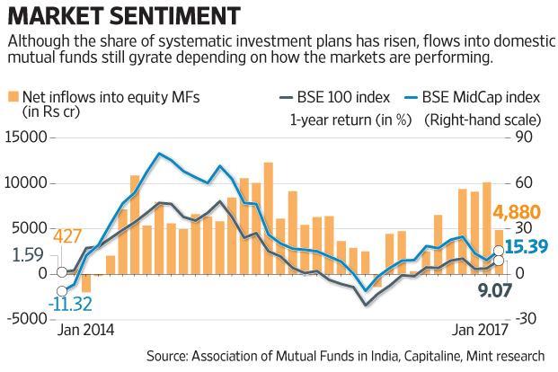 Indian equity mutual funds (MFs) have received net inflows of a little over Rs2 trillion since May 2014. Monthly inflows stood at around Rs6,100 crore during this period. In recent months, inflows from systematic investment plans (SIPs) alone have amounted to around Rs4,000 crore per month.